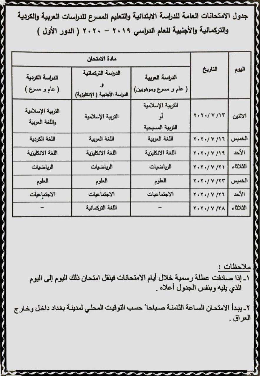 جدول امتحانات الوزارية للصف السادس الابتدائي 2019 2020 الدور الاول
