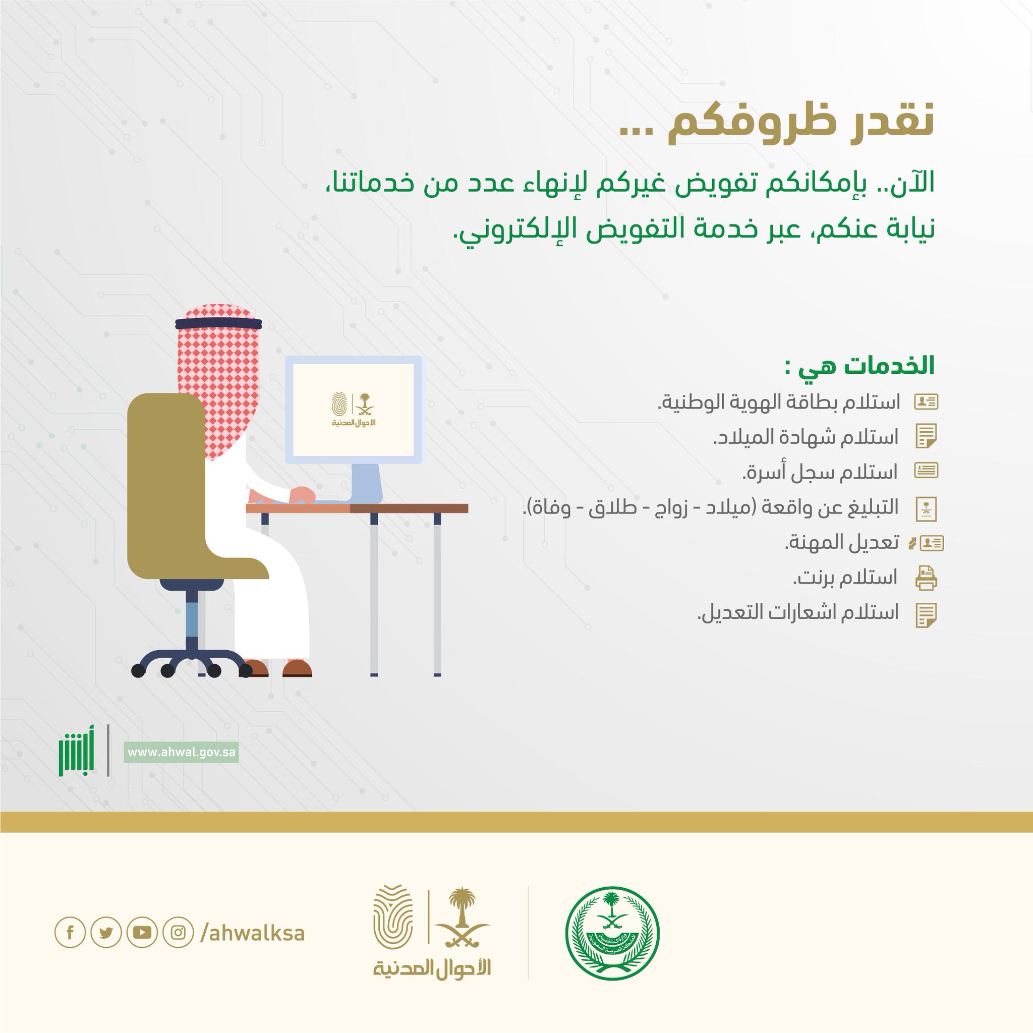 الأحوال المدنية على تويتر خدمة التفويض الإلكتروني تمكنك من تفويض مواطن آخر لإنهاء اجراءاتك نيابة عنك عبر أبشر الأحوال المدنية