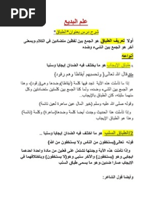 ي س ت خ ف ون م ن الن اس و لا ي س ت خ ف ون م ن الل ه وأما المقابلة فهي طباق متعدد وجمع ومقابلة بين المعاني وأضدادها أي أنها استمرار للطباق. لا ت ق ل ل ه م ا أ ف و لا. توكيد المعنى وتوضيحه وبضدها تتميز الأشياء يشمل طباق الإيجاب أنواع اللمة الثلاثة. ي س ت خف ون م ن الن اس و لا ي س ت خف ون م ن الله.
